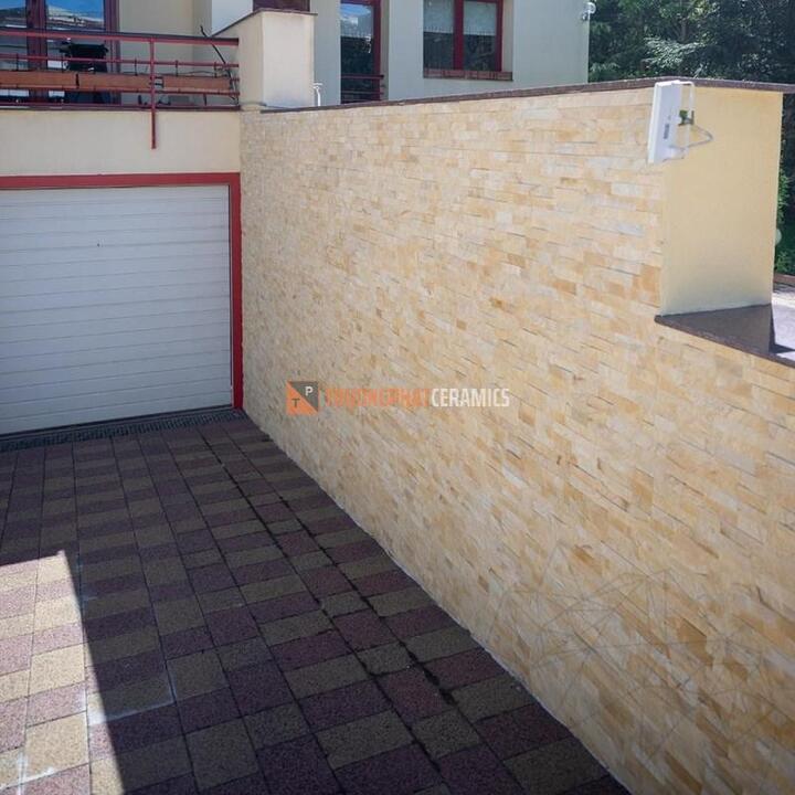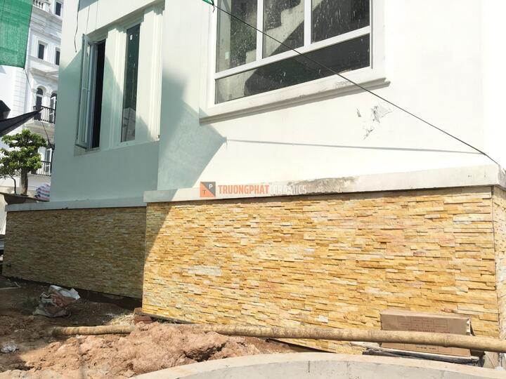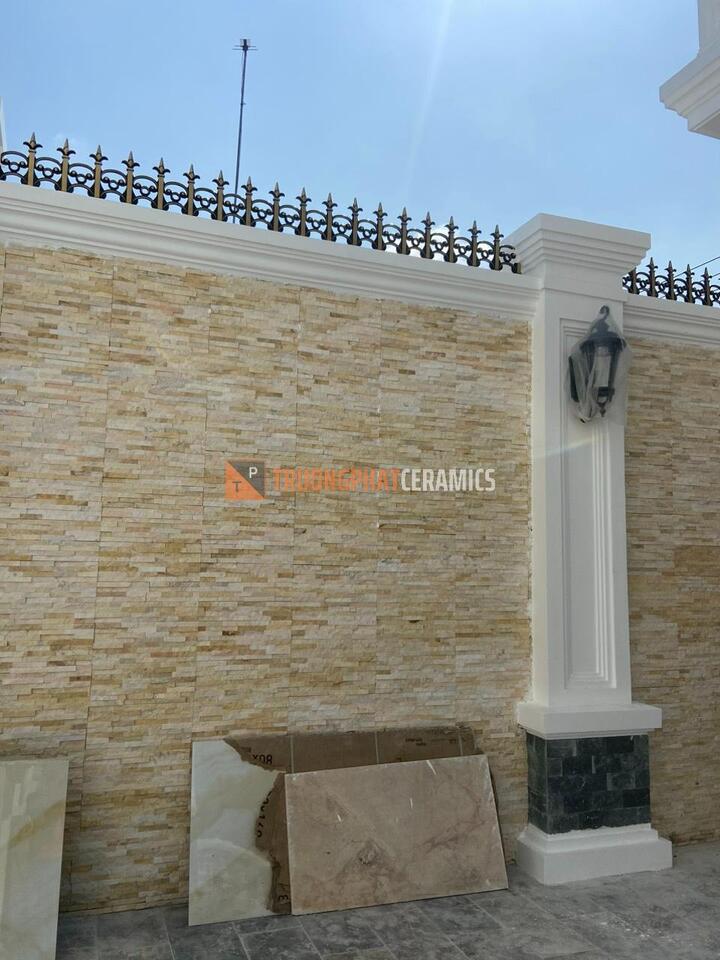 Ngoài việc trang trí nội thất, đá ghép vàng cũng được sử dụng phổ biến để trang trí cho không gian ngoại thất như tường rào, cột trụ hay hồ bơi. Việc ốp tường bằng đá ghép vàng giúp tạo nên vẻ đẹp hoàn hảo cho ngôi nhà.