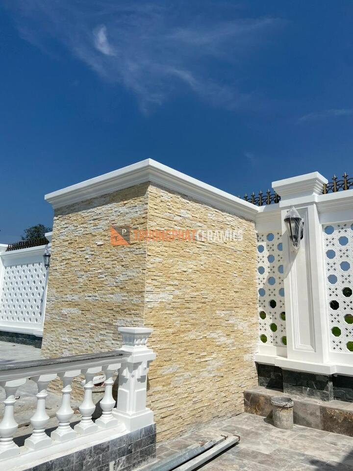 Với khả năng chịu lực tốt, đá ghép vàng ốp tường rất phù hợp để sử dụng ở các khu vực tiếp xúc trực tiếp với môi trường bên ngoài như tường rào, cột trụ hay hồ bơi.