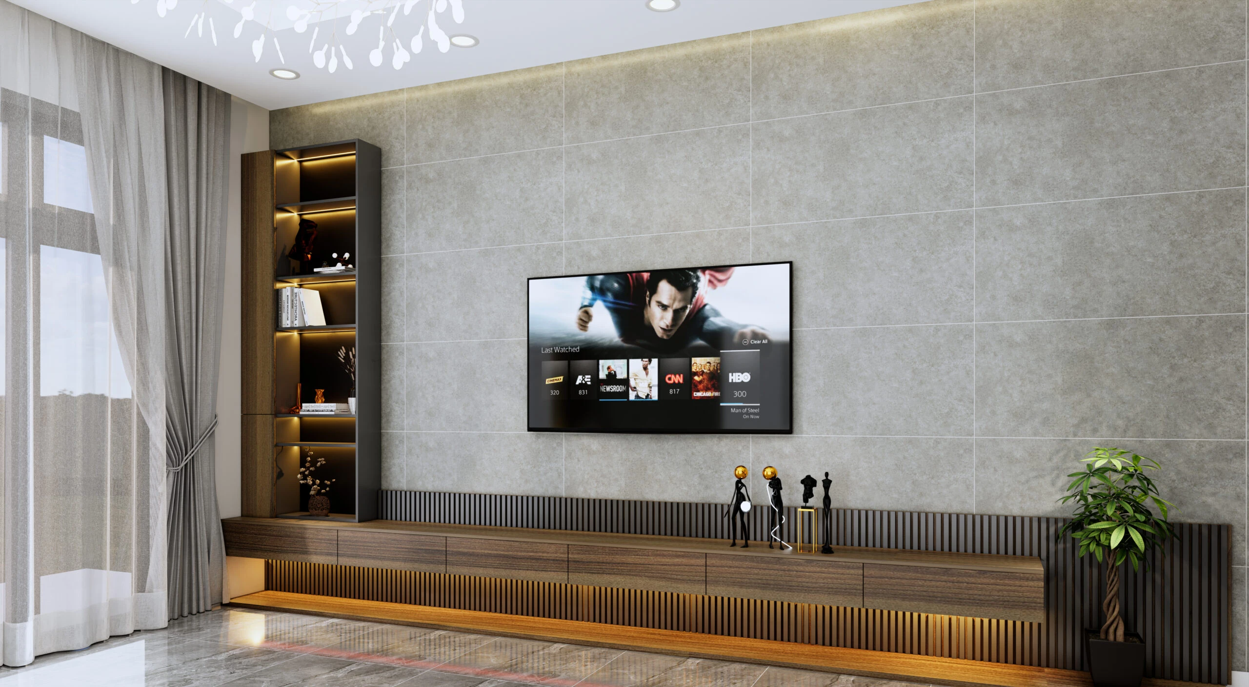 Vách tivi được ốp bằng gạch khổ lớn men khô với vân gạch và bề mặt men có chiều sâu tạo nên một không gian độc đáo, phá cách và hiện đại.