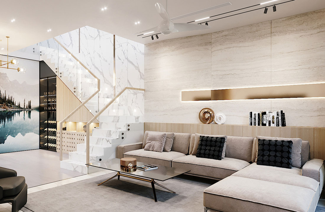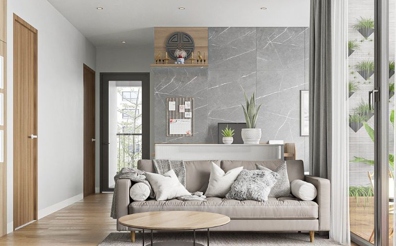 Gạch ốp tường phòng khách vân đá tôn lên sự sang trọng cho phòng khách.