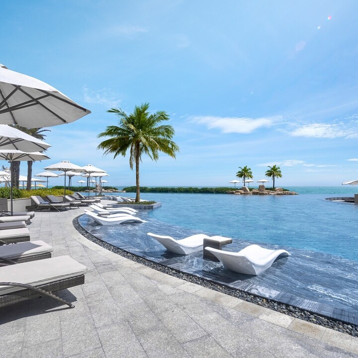 Bề mặt nhám của đá granite trắng khò là lựa chọn số 1 để lát quanh hồ bơi, vừa tạo cảm giác gần gũi với thiên nhiên, vừa đảm bảo an toàn cho người sử dụng.