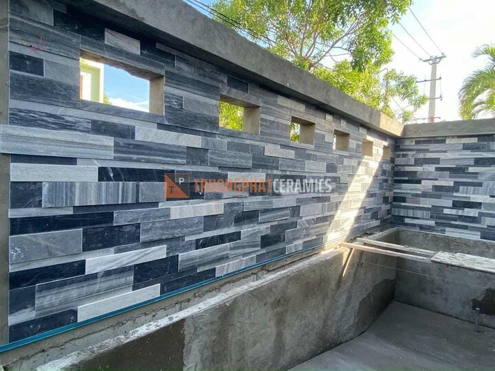 Ngoài việc trang trí nội thất, đá sọc dưa cũng được sử dụng rộng rãi để ốp tường cho các không gian ngoại thất như ban công, sân vườn, hồ bơi… Việc sử dụng đá sọc dưa không chỉ tạo điểm nhấn esthetic mà còn giúp bảo vệ tường khỏi tác động của thời tiết và môi trường bên ngoài.