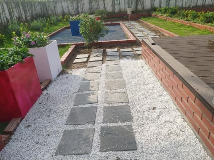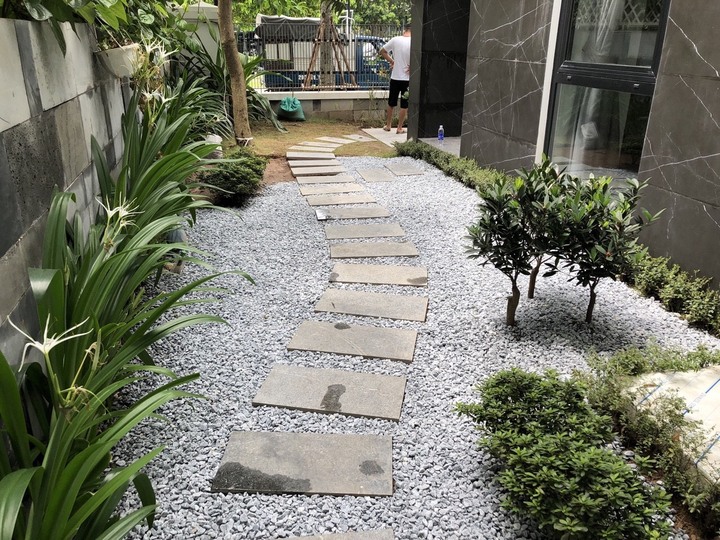 Bước 4: Hoàn thiện: Có thể rải thêm sỏi, đá nhỏ hoặc trồng cỏ xung quanh các phiến đá để tăng tính thẩm mỹ.